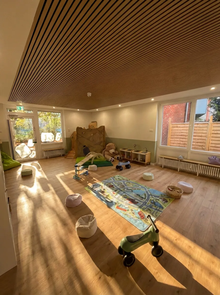 Helle Räume, natürliche Materialien und viel Platz zum Entdecken — hier fühlen sich Kinder von Anfang an zu Hause.